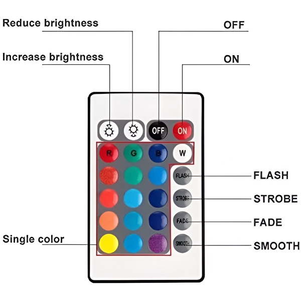 AQUASHEIN è dotato di un comodo telecomando che consente di regolare l’illuminazione con facilità. Con 24 tasti, è possibile scegliere tra 16 colori RGB e quattro modalità dinamiche (flash, strobo, fade, smooth). È possibile controllare le luci da una distanza massima di 10 metri, garantendo una personalizzazione senza problemi.